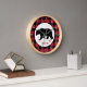 This clock features a black bear wth a red arrow over a red buffalo plaid background