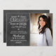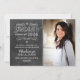 Announce your graduate in style with this whimsical style photo graduation announcement that features a black chalkboard textured background look with handwritten white chalk text, scrolls, and doodles next to a portrait photo space. The back of these stylish cards can be customised as invitations for a graduation party to celebrate the occasion.