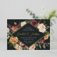 Elegant floral wedding invitations or fall or winter weddings feature your details nestled inside an elongated diamond surrounded by watercolor roses, mums and greenery in rustic autumn colours including peach, ivory, blush, burgundy and green. Gold foil trim completes the design.
