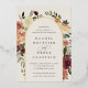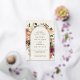 Elegant floral wedding invitations or fall or winter weddings feature your details framed by an arch of watercolor roses, mums and greenery in rustic autumn colours including peach, ivory, blush, burgundy and green, with sleek gold foil trim. A modern and elegant design for rustic chic weddings in the fall or winter months.