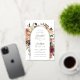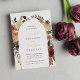 Elegant floral wedding invitations or fall or winter weddings feature your details framed by an arch of watercolor roses, mums and greenery in rustic autumn colours including peach, ivory, blush, burgundy and green, with sleek gold foil trim and gold calligraphy script lettering on a white background. A modern and elegant design for rustic chic weddings in the fall or winter months.