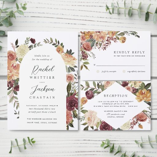 Elegant floral wedding invitations or fall or winter weddings feature your details encircled by watercolor roses, mums and greenery in rustic autumn colours including peach, ivory, blush, burgundy and green, with sleek gold foil trim. A modern and elegant design for rustic chic weddings in the fall or winter months.