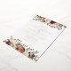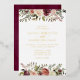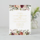 Elegant floral wedding invitations or fall or winter weddings feature your details in luxe gold foil lettering accented by top and bottom borders of watercolor roses, mums and greenery in rustic autumn colours including peach, ivory, blush, burgundy and green. Cards reverse to a subtly mottled deep cabernet.