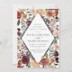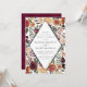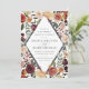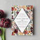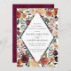 Elegant floral wedding invitations or fall or winter weddings feature your details nestled inside an elongated diamond surrounded by watercolor roses, mums and greenery in rustic autumn colours including peach, ivory, blush, burgundy and green.