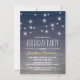 Adult mens birthday invitations featuring a rustic wooden blue ombre background, harbour deck string twinkle lights and modern wording.