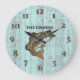 Silhouette of a prize fish on the line against rustic wood plank. Rough blue painted planks. Customisable family or lodge name. Rustic mountain cabin or coastal style.