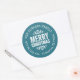 Affordable custom printed round return address stickers personalised with your family name and return address. This rustic modern holiday design features distressed MERRY CHRISTMAS lettering on a blue background. Use the design tools to choose any background colour and edit text fonts and colours to further customise your own unique holiday return address labels.