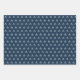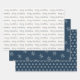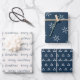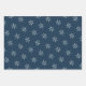 A rustic set of three coordinating wrapping paper sheets in a deep blue and ivory colour palette. One has Merry Christmas written in a modern handwritten font. The second features an abstract Christmas tree pattern and the third sheet has a snowflake pattern.