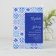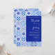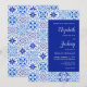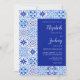 This rustic design features a background pattern of blue and white watercolor Portuguese tiles, or azulejos. Personalise it with the names of the bride and groom in white calligraphy script and the remaining text in a combination of sans serif, copperplate and italics on a blue rectangle aligned with the right edge of the card. A matching tile pattern appears on the reverse side.