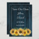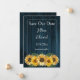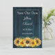 Personalise a unique wedding announcement with a Rustic Blue Sunflower Save the Date. Announcement design features a rustic wooden background with an elegant bouquet of sunflowers. Additional save the date announcement available for this design in a variety of colours.