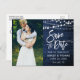 Modern Brush Script, Rustic Blue Wood, String Lights Save The Date Engagement Couple Photo Postcard
