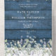 All in one wedding invitation featuring pretty watercolor greenery foliage and elegant modern typography on a blue rustic wood panels background. The invitation includes a perforated RSVP card that can be individually addressed or left blank for you to handwrite your guest's address details. Designed by Thisisnotme©