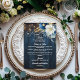 An elegant Wedding design with elegant calligraphy completed by wonderful blue wood, garden string lights and white blue floral with gold glitter. You can personalise this with your Wedding menu.
