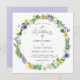 This is a simple, sweet and casual wildflower themed wedding invitation. The design features a wreath made with a variety of spring wildflowers including yellow daffodils, purple pansies, clovers, lavender, sweetpeas, dandelions, tulips and fern and ivy greenery.