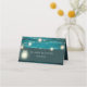 Rustic Boho Blue Wood and Mason Jar String Lights Wedding Table Placement Cards. Script font highlights with easy to read serif name font. Easy to adjust for your own wedding needs. Personalised table name cards.