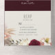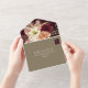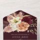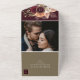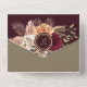 This rustic all-in-one wedding invitation features a stunning floral arrangement of burgundy, peach, and ivory blooms with pampas grass and greenery, perfect for fall or boho-inspired weddings. The foldable design includes a built-in RSVP and a personalised photo and return address on the back flap. A romantic and eco-friendly choice for couples seeking both style and convenience. Please note: This all-in-one invitation requires a separate envelope for mailing. We recommend pairing it with a standard A9 envelope (5.75" x 8.75") for best fit.