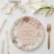 Beautiful rustic boho-chic dried palm fronds, roses and orchid geometric frame on pink sand colour background, personalised paper plates. Designed to match our Bohemian Oasis Wedding Collection.