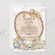 This unique boho baby shower thank you card features a mix of vintage rustic accents in warm tones like beige, fawn, and brown. Adorable jungle animals, including a lion, monkey, tiger, zebra, rhino, elephant, and giraffe, add a playful touch. Elegant pampas grasses and palm leaves complement the wood slice background, creating a cosy and inviting atmosphere.