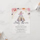 Boho chic girl baby shower invitations with watercolor flowers, teepee, feathers and script font on a wood background.
