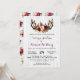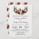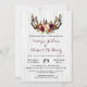 Rustic Boho Wedding Invitation announcement with watercolor burgundy flowers, feathers and deer antlers on an old, white washed barn wood background.