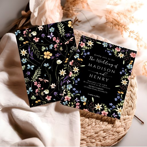 Rustic Botanical Wildflower Black Bridal Shower Invitation