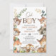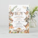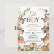 Boy's woodland themed baby shower invitation featuring various woodland animals, foliage and branches. This oh boy forest animals baby shower invitation also features a decorative heading with a wood slice.