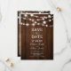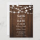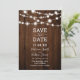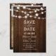 Rustic brown wood and white string lights photo save the date. Perfect for a cool small casual wedding for fall and winter , for a barn outdoor country wedding theme.