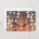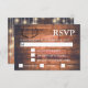 Rustic wedding RSVP card with a wood background with string lights. The date to RSVP by has a labelled text box to help you customise it for your day.