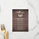 Rustic brown wood wedding reception dinner menu with deer antler heart logo. Elegant template for classy wedding party. Vintage wooden panel background texture with stylish script typography. Customisable templates for couples getting married. Part of beautiful matching set.