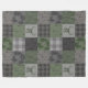 Woodland themed patchwork design in green and greys. Plaids, Arrows, trees, And a rustic buck’s Head.