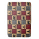 Rustic bath mat with a patchwork of red and black buffalo check alternating with patches of a wood plank design. Bears and pine trees are mixed into the pattern. Perfect for your mountain home or vacation rental.