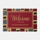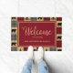 Rustic "welcome" door mat with a patchwork of red and black buffalo check alternating with patches of a wood plank design. Bears and pine trees are mixed into the pattern. Personalise with "Welcome" and your family name, or any text you choose. Perfect for your mountain home.