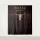 Rustic bull cow skull western country cowboy wedding dinner reception photo booth backdrop. Customised brown texture farmhouse style for the bride and groom. Old wild west vintage antique inspired marriage prop. Cool, trendy, modern farm animal design. Customise your typography. Image copyright Marg Seregelyi Photography.