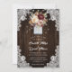 Rustic floral wedding invitation featuring a bouquet of burgundy, mauve and beige flowers and greenery inside a mason jar against a barn wood background adorned with white floral lace and twinkle lights. Perfect card design for inviting your guests to your burgundy and beige rustic wedding party.