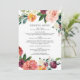 Wedding dinner menu card design features stylish wording that can be completely personalised, accented by a rustic floral watercolor design with beautiful roses, dahlias, peony flowers, and greenery, in a gorgeous autumn palette of burgundy red, golden yellow, peach orange, blush pink, and shades of green. A burgundy red background colour with a textured appearance dresses up the back of the card.