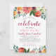 This elegant boho style wedding bridal shower invitation design features "celebrate the bride-to-be" wording with a rustic summer and fall floral watercolor border design with roses, dahlias, peony flowers, and greenery in a gorgeous palette of burgundy red, golden yellow, peach orange, blush pink, and shades of green. Personalise the custom text with the bride's name, event, and registry information. A burgundy red background with textured appearance dresses up the back of the card.