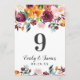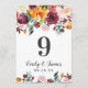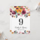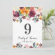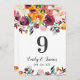 Rustic romantic style wedding table number cards feature a monogram and number framed by a summer and fall floral watercolor border design with beautiful roses, dahlias, peony flowers, and greenery, in a gorgeous autumn palette of burgundy red, golden yellow, peach orange, blush pink, and shades of green.