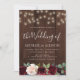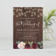 Rustic wood background with burgundy navy watercolor flowers and white script text.