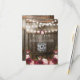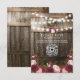Country wedding rsvp cards featuring a rustic wood barrel background, twinkle string lights, burgundy & pink watercolor flowers, your monogram and a QR code for your wedding guests to scan.