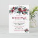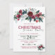 Traditional rustic elegant winter floral Christmas dinner party invitation template on white background featuring red burgundy and white peony roses bouquets with seasonal hunter and pine green fir branches, red berries and foliage. +++++++++++++++++++ The invitation is suitable for winter chic rustic floral country / farmhouse Christmas family seasonal parties.