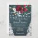 Elegant chic winter wedding stylish invitation template on dark pine green chalkboard featuring a beautiful red burgundy and white flowers bouquet with hunter green foliage, strings of white twinkle lights, lace corners, and a handwritten calligraphy script. ++++++++++++++ Easy to personalise with your details! +++++++++++++++ The invitation is suitable for elegant winter rustic country / farmhouse / cottage / Christmas weddings.