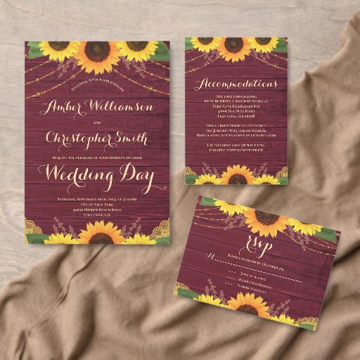 This rustic country design features gold string lights, sunflowers, and burgundy marsala sprigs on the inside of the envelope against a maroon burgundy red barn wood background. A customisable name and return address appear on the front in pale gold in popular script and serif typography on the same burgundy wood background. You can personalise this invitation for your own wedding by changing the text in the template.