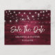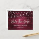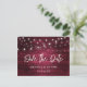 Rustic burgundy wedding save the date postcard featuring rustic wood adorned with string lights.
