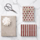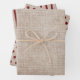 Three sheet wrapping paper in coordinating rustic burlap and burgundy. Sheet 1 is a solid brown burlap, sheet 2 is a burgundy polka dot pattern on burlap, and sheet 3 is a burgundy striped pattern on burlap. Contact us for help with customisation or to request matching or coordinating products.