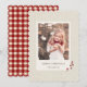 Rustic faux burlap canvas texture holiday photo card with winter red berry branch and red plaid pattern on the back.