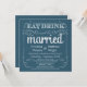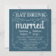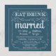 Eat, Drink, and be Married -- Vintage style rustic country wedding invitations -- Swirly, curly scrolls and old-fashion typography on southern-style denim blue burlap background. Add your names and wedding info in this easy to use template. Elegant but fun and whimsical, chalkboard style script writing can be modified for your formal or semi-formal retro wedding theme. Casual modern style is perfect for trendy contemporary weddings with a fun touch of sophisticated charm for traditional couples. Please contact us for help with customisation if you need additional room for your wedding details. Other sizes and chalkboard styles available, along with coordinating styles for engagement party and bridal shower. NOTE: This product design is set-up for square cards only -- requires extra postage.