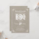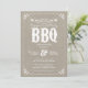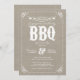 Modern vintage country chic engagement party barbecue party invitation design with rustic elegant distressed typography and a cute dotted border with vintage scroll corner details on a printed faux burlap canvas texture background. Click the CUSTOMIZE IT button to customise fonts, move text around and create your own unique one-of-a-kind invitation design.