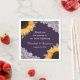 Decorate your purple rustic wedding party with these elegant botanical wedding napkins featuring sunflowers and greenery on a purple burlap and lace background adorned with string lights.