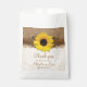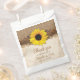 Rustic burlap, lace, and wood yellow sunflower wedding favour bags. This unique rustic sunflower wedding bag design features a bright yellow sunflower, a burlap and lace look background, and a wood and leather look emblem under the sunflower. A pretty design for a summer or fall / autumn wedding. It can work for rustic, barn, farm, western, or country style weddings. There are a lot of subtle details in the design. Browns, yellows, beige are the prominent colours.