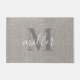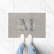 Custom-designed doormat featuring personalized monogram and family name in modern hand calligraphy printed on a rustic burlap/farmhouse style background.